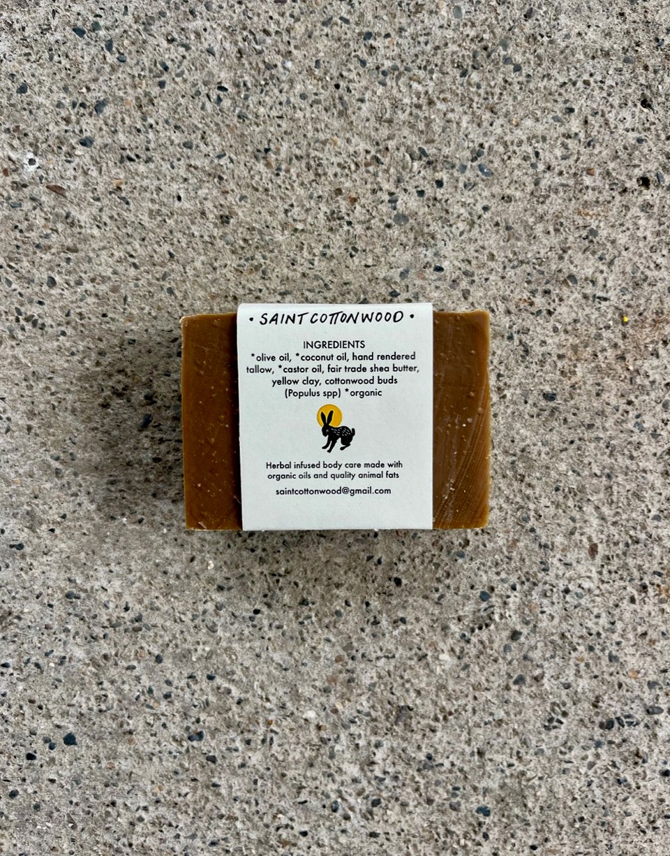 INGREDIENTS - *olive oil, *coconut oil, tallow, *castor oil, *unrefined shea butter, wildcrafted cottonwood buds (Populus spp.).