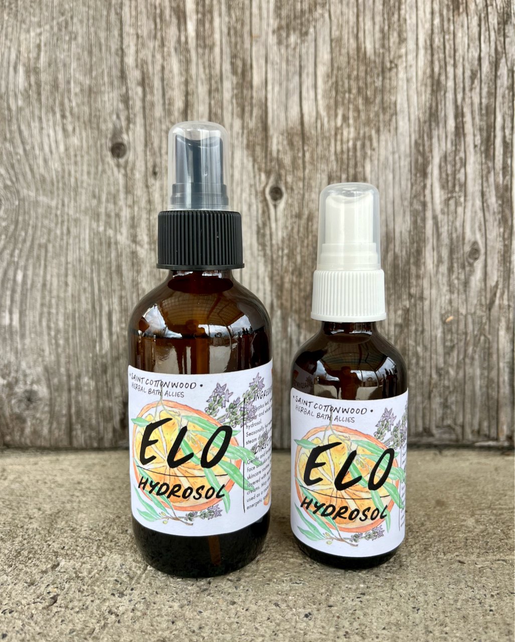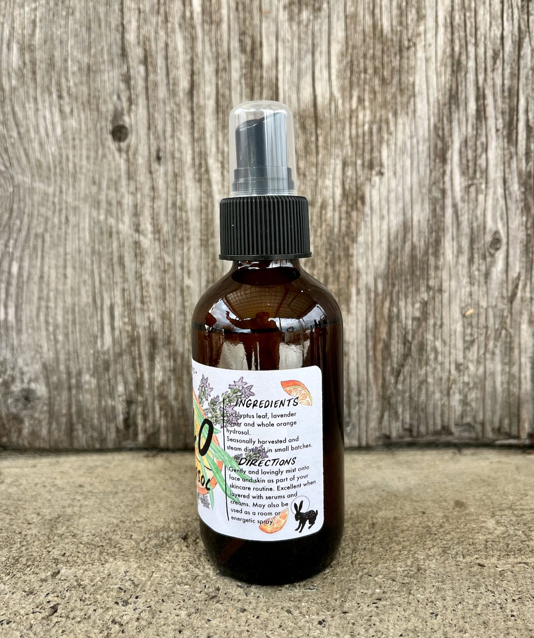 A vibrant blend of eucalyptus, lavender and orange hydrosol. This blend is special for saint cottonwood because it is the only one that I do not do 100% of the harvesting for. When my partner goes to northern California every spring to do bee keeping he brings back eucalyptus leaves and oranges from untended trees near the farms. I then distill the leaves and fruits into amazing fragrant hydrosols.