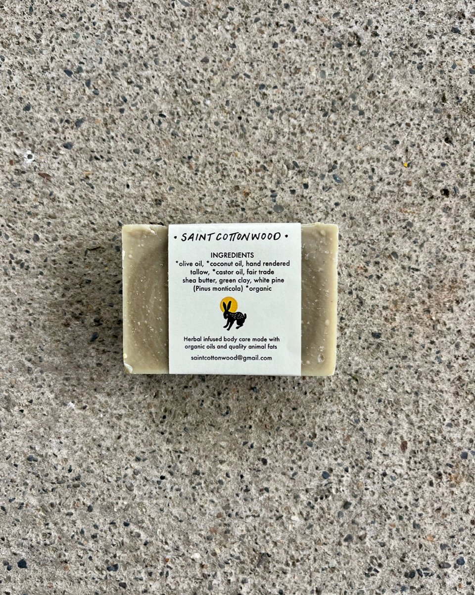 This light green bar of soap gets its color from white pine hand harvested and infused in oils. These potent oils are then blended with organic oils and local animal fats to nourish the skin. This cold process soap makes a rich creamy lather lightly scented and sprinkled with white pine.